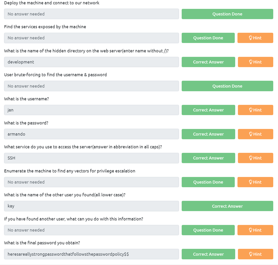 For this were going to use gobuster with, gobuster dir -w /usr/share/wordlists/dirbuster/directory-list-2.3-medium.txt -u 10.10.193.196. From there we can see a /development directory. If we go there we see two .txt documents with some hints.