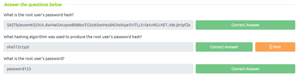 What hashing algorithm was used to produce the root user’s password hash?