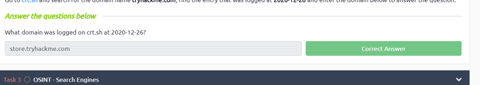 For this we just go to crt.sh and search tryhackme.com and scroll to 2020-12-26 and we can see store.tryhackme.com was logged.