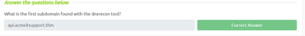 All we need to do is click the open site and at the top of the right window pane we click run dnsrecon and we get 2 results including api.acmeitsupport.thm