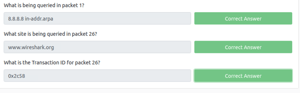 To grab this if we click on packet one we need to scroll down and open the DNS tab. Now we can dig further by opening thee queries tab and we can see the query is to Name: 8.8.8.8.in-addr.arpa